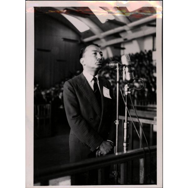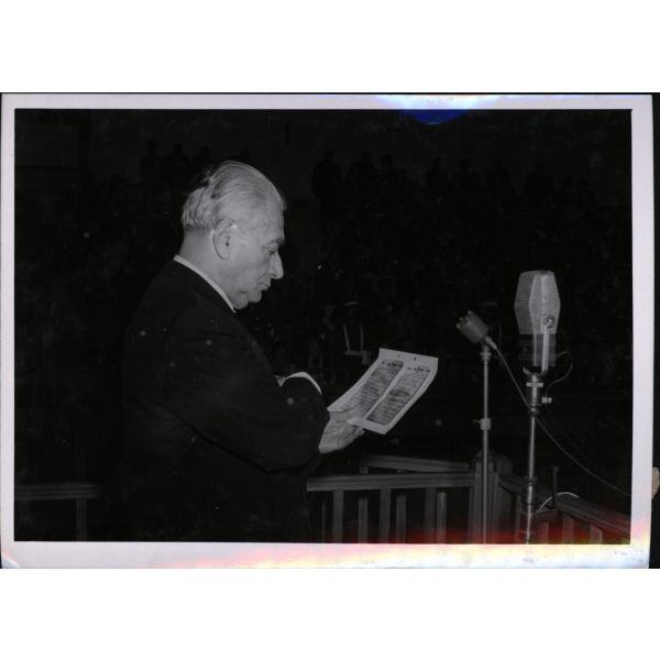1950 - 1960 yılları arasında TBMM Başkanlığı yapan ve 27 Mayıs Darbesi´yle görevine son verilerek idamla yargılanan ancak cezası ömür boyu hapse çevrilen Refik Koraltan (1889 - 1974) mahkemede savunmasını yapıyor.