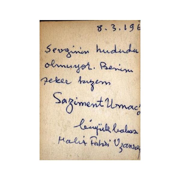 Beş Hececilerden, şair ve yazar Halit Fahri Ozansoy’dan (1891 – 1971), torunu Şazimet Umaç´a "Sevginin hududu olmuyor benim şeker kızım" ithafıyla imzalı...