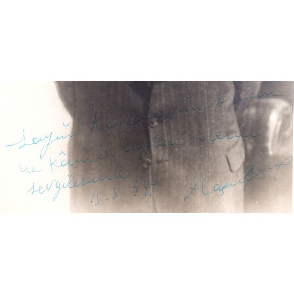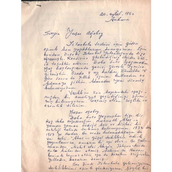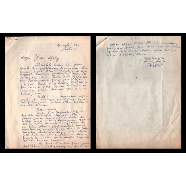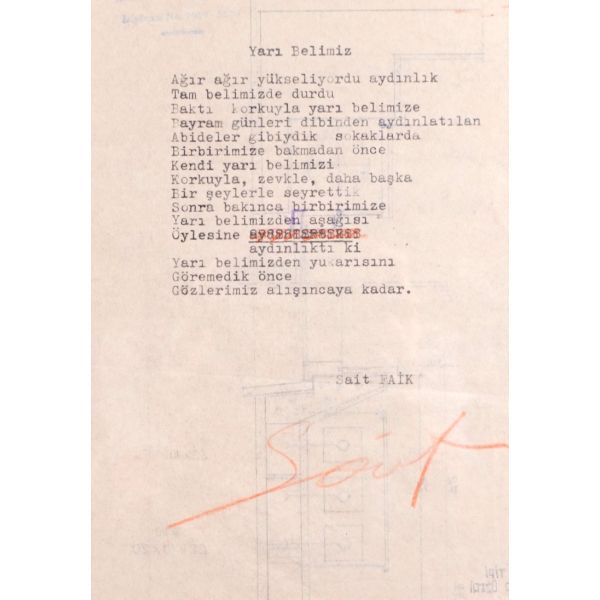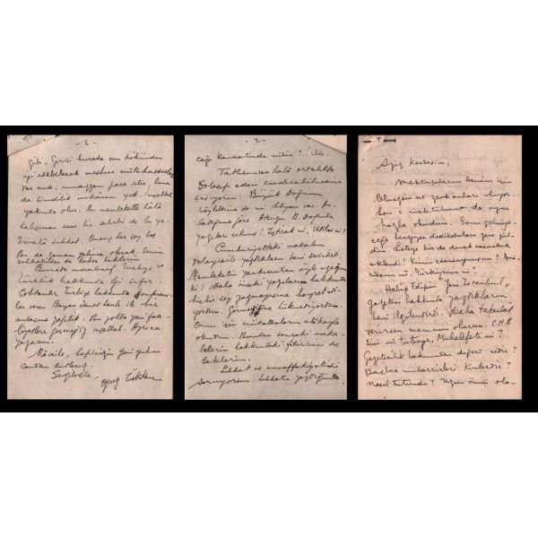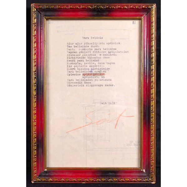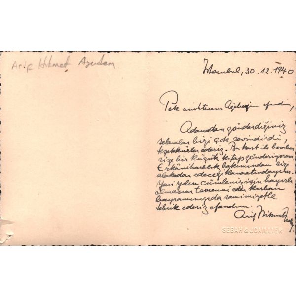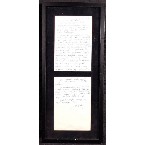 Modern hikâyeciliğimizin en önemli ismi olan Sait Faik (1906-1954), hikâye kadar ağırlık vermemekle birlikte, şiirlerinde de özgün tarzını hiç yitirmeden hikâyelerine benzer bir dünya yaratmış, kimilerine göre, daha fazla kendisi olmuştur. Müzayedede sunulan eser, Sait Faik´in yakın arkadaşı ve doktoru olan hikâyeci Fikret Ürgüp´ün antetli kâğıdına yazılmıştır.