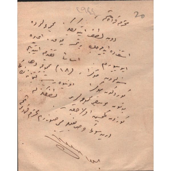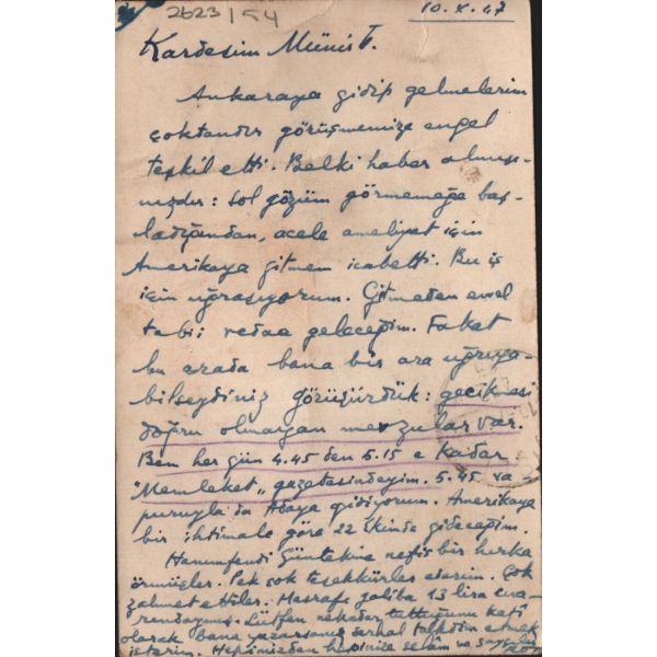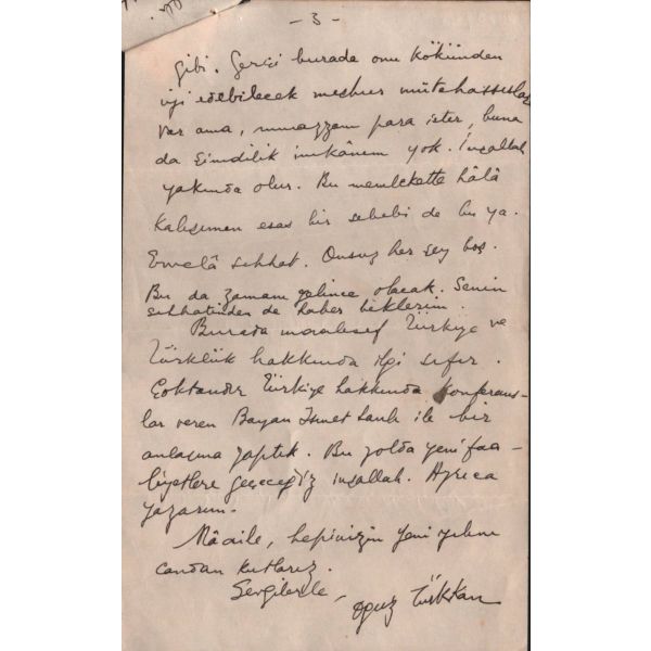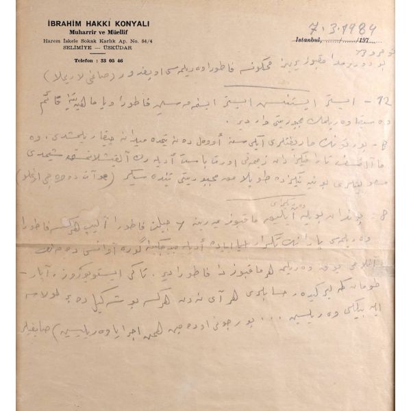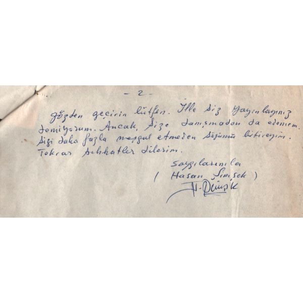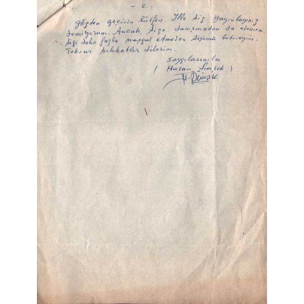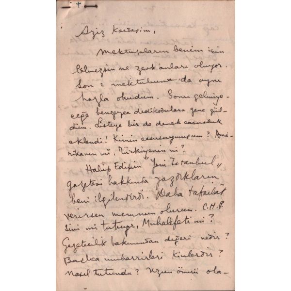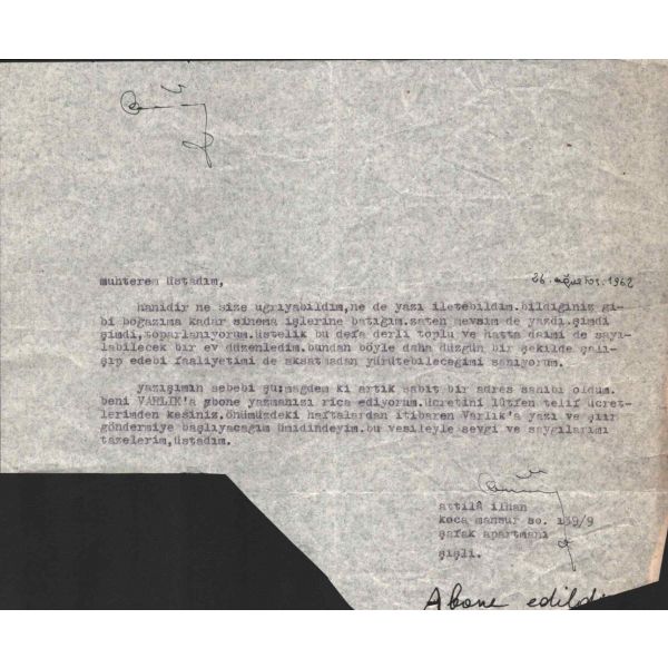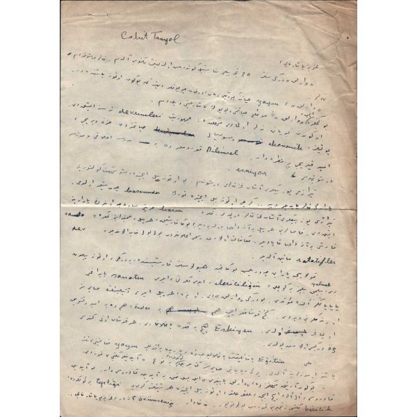 Modern hikâyeciliğimizin en önemli ismi olan Sait Faik (1906-1954), hikâye kadar ağırlık vermemekle birlikte, şiirlerinde de özgün tarzını hiç yitirmeden hikâyelerine benzer bir dünya yaratmış, kimilerine göre, daha fazla kendisi olmuştur. Müzayedede sunulan eser, Sait Faik´in yakın arkadaşı ve doktoru olan hikâyeci Fikret Ürgüp´ün antetli kâğıdına yazılmıştır.