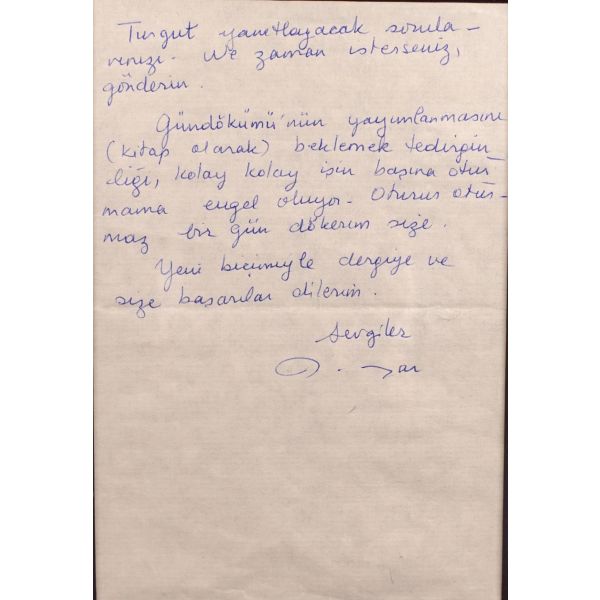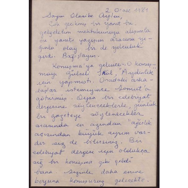 Tomris Uyar (1941-2003) Türk öykü yazarı ve çevirmendir. Cemal Süreya ve Ülkü Tamer ile beraber Papirüs dergisi kurucularından olan Uyar’ın deneme, eleştiri ve kitap tanıtma yazıları Yeni Dergi, Soyut, Varlık gibi dergilerde yayımlanmıştır. Hasibe Ayten ise daha çok yayıncı kimliği ile ön plana çıkar; ilk şiiri 1971´de Sesimiz dergisinde yayımlanmıştır. Türk Dili Dergisi, Yeni Biçem, Edebiyat ve Eleştiri ve Somut gibi dergilere yazılar yazmıştır. Müzayedemizdeki bu mektup ise Gülseli İnal´ın Somut adlı edebiyat dergisine yazdığı yazı ve Gündökümü kitabına dairdir.