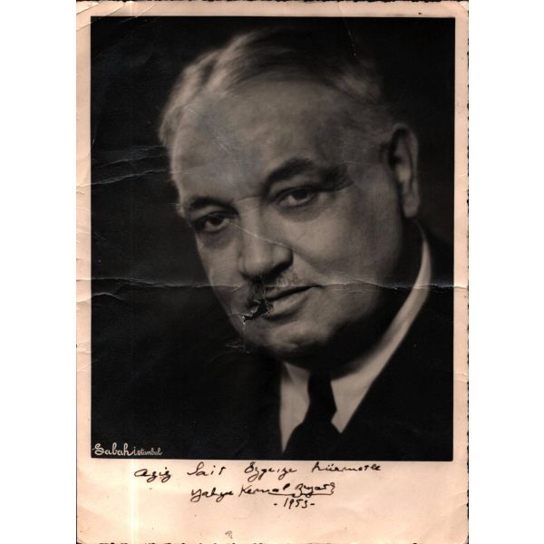 Sağlığında hiç kitap yayımlamamış olmasına karşın, dergi ve gazetelerde yayımladığı şiirleri ve yazılarıyla, yaşadığı dönemde Türk şiirinin ve nesrinin en büyük temsilcilerinden biri olarak kabul edilen Yahya Kemal (1884 – 1958), edebi çevrelerde hep “üstat” olarak anılmış ve her çevreden saygı görmüştür. / Müzayedeye sunulan fotoğrafta hafif kırışıklıklar ve şairin ağız kısmına denk gelen küçük bir kopukluk vardır.