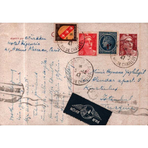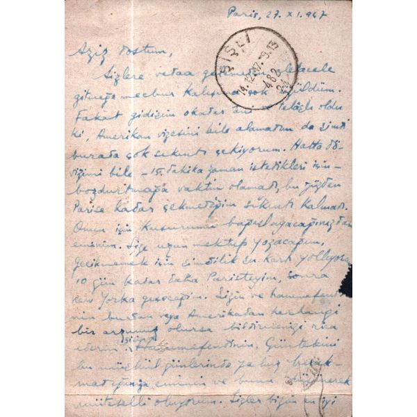 Türkçülük hareketinin önde gelen isimlerinden, tarihçi, Türkolog, hukukçu ve yazar, Ord. Prof. Dr. Reha Oğuz Türkkan´ın (1920 - 2010), yazar ve çevirmen Münir Haymana Yaylalıgil´e gönderdiği kart - mektup… Aslında Amerika´ya gitme amacında olan yazar, Türkiye´den apar topar ayrıldığını ve Amerika vizesi alamadığı için bir süre daha Paris´te kalmak zorunda olduğunu belirtiyor.