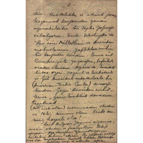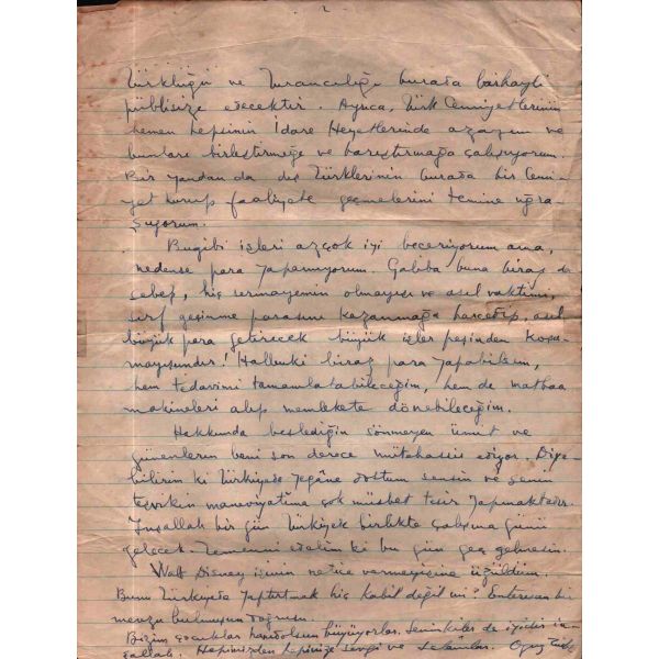 Türkçülük hareketinin önde gelen isimlerinden, tarihçi, Türkolog, hukukçu ve yazar, Ord. Prof. Dr. Reha Oğuz Türkkan (1920 - 2010), 1944 Irkçılık - Turancılık davasında hüküm giyip tahliye olduktan sonra 1947 yılında Amerika´ya gitti ve 1975 yılına kadar Columbia Üniversitesinde dersler verdi. Muhatabı bilinmeyen mektupta Türkkan, Kore´deki yaralılarımız için binlerce dolarlık hediye toplayıp gönderdiğini, Amerika´daki Türk cemiyetlerinin hepsine üye olduğunu, dış Türklerin bir cemiyet kurup faaliyete geçmelerini temine çalıştığını yazıyor.