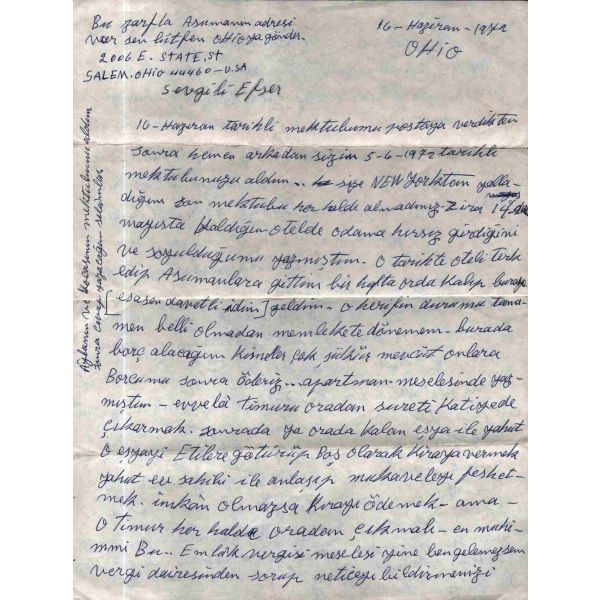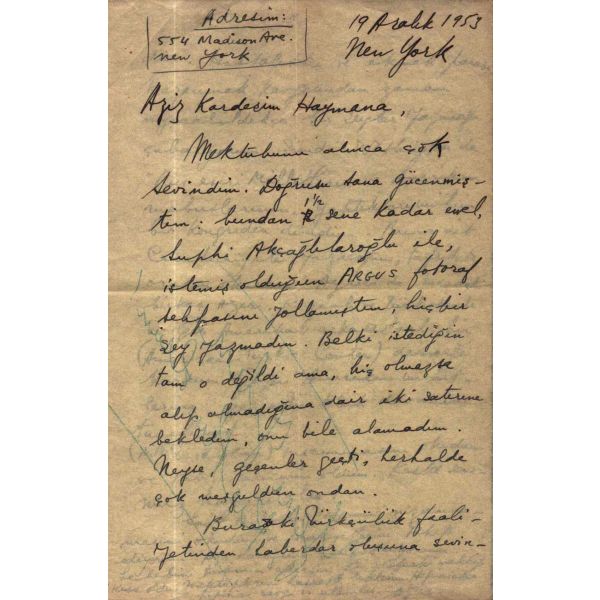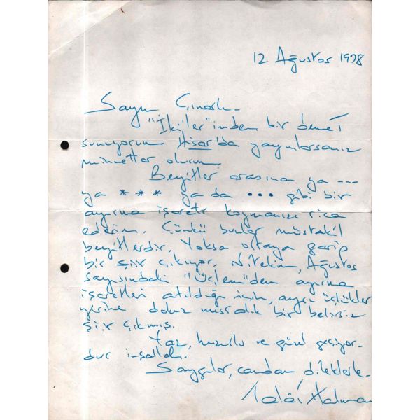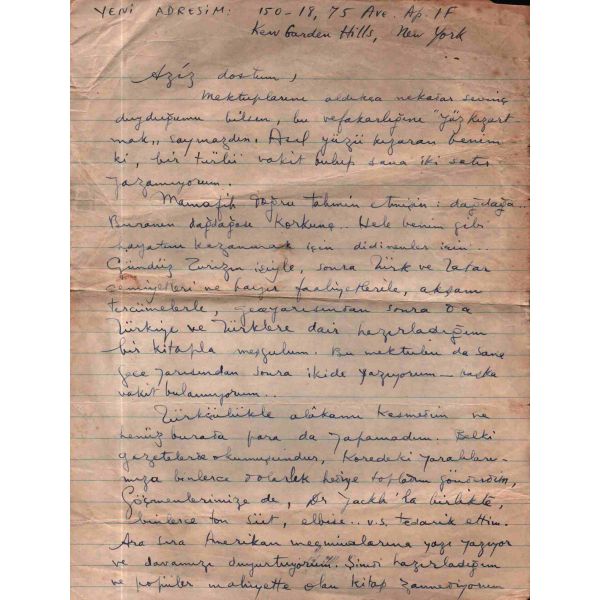 Şair, yazar, çevirmen, akademisyen, diplomat ve siyasetçi Talat Sait Halman´dan (1931 - 2014) Hisar dergisinin kurucusu, şair Mehmet Çınarlı´ya (1925 - 1999) New York´tan gönderilmiş, 12 Ağustos 1978 tarihli mektup…