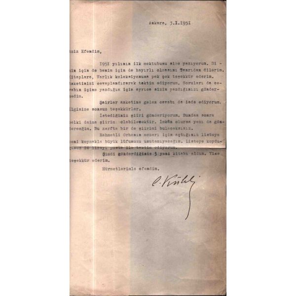 Türk şiirinde görülen herhangi bir edebi akıma dahil edilemeyen, gelenek çizgisine çok yakın ve milli kaynaklardan beslenmekle birlikte kendine has bir üslup oluşturmayı başaran Cahit Külebi´nin (1917-1997), Varlık dergisi ve Varlık Yayınları kurucusu Yaşar Nabi Nayır´a yazdığı mektup... "Rahmetli Orhan´ın mezarı için açtığınız listeye beni koymakla büyük lütfunuzu unutmayacağım."