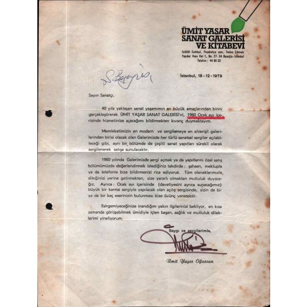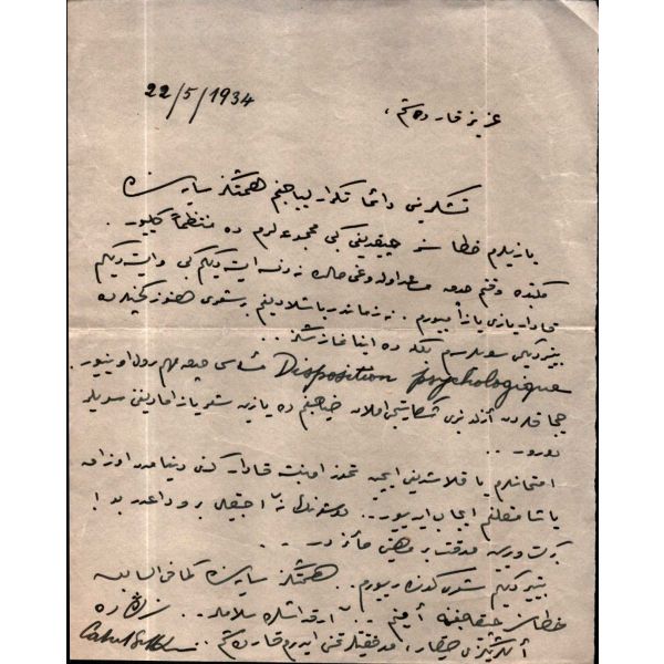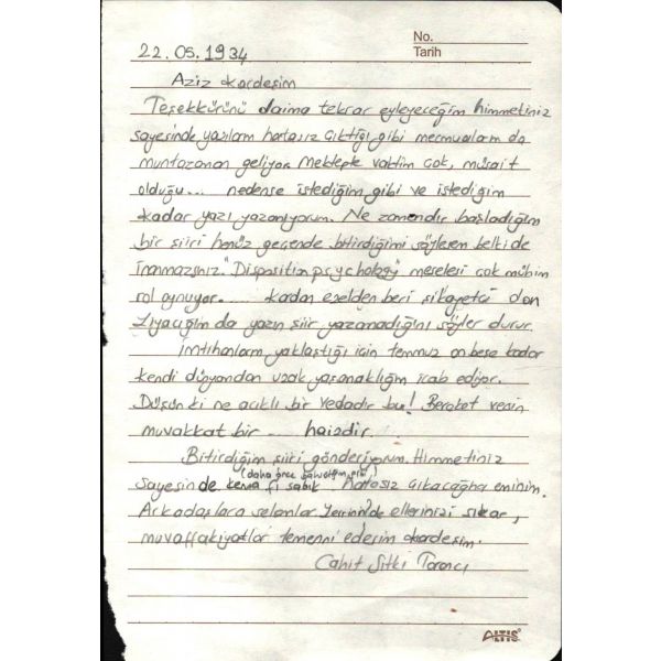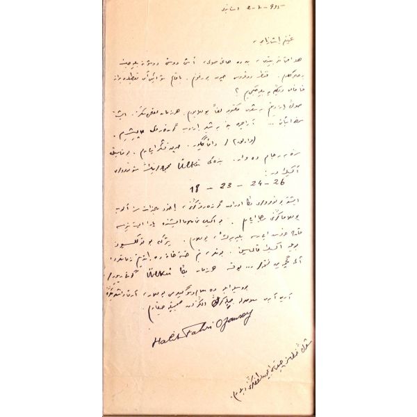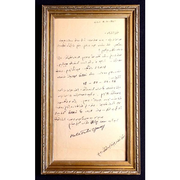 Beş Hececilerden Halit Fahri Ozansoy´un (1891 - 1971) Varlık dergisi ve Varlık yayınları sahibi Yaşar Nabi Nayır´a, 2.7.1935 tarihli mektubu: "... Son yazdığım bir şiiri mektubuma leffen [ek halinde] yolluyorum. Her zaman aklımdasınız, işte size isbatı... Ara sıra yine bir şiir yazıp göndermeye çalışırım..." *Eski ahşap çerçeve içinde; çerçeve boyutları: 18x30 cm