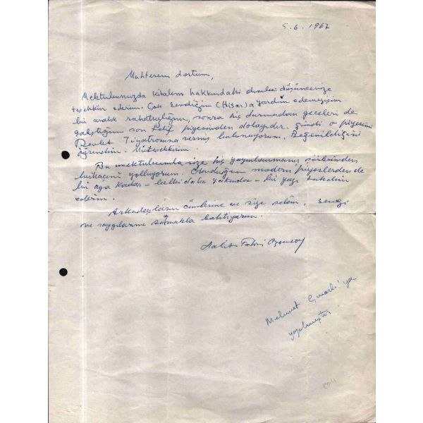 Beş Hececilerden, şair ve yazar Halit Fahri Ozansoy’un (1891 – 1971), Hisar dergisi kurucularından Mehmet Çınarlı´ya (1925 - 1999) yazdığı, 5.6.1967 tarihli mektubu…