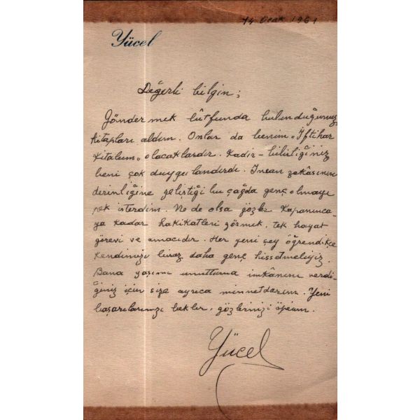 Türkiye´nin en önemli Milli Eğitim Bakanı ve en değerli kültür insanlarından biri olan Hasan Ali Yücel´in (1897 - 1961), "Değerli Bilgin" hitabıyla başlayan ancak muhatabını bilemediğimiz bir teşekkür mektubu… "İnsan zekâsının derinliğine geliştiği bu çağda genç olmayı pek isterdim. Ne de olsa gözler kapanıncaya kadar hakikatleri görmek, tek hayat görevi ve amacıdır..."