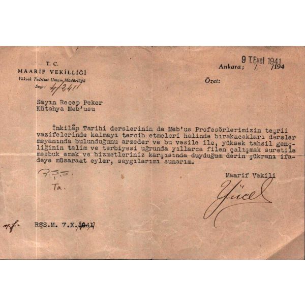 Türkiye´nin en önemli Milli Eğitim Bakanı ve en değerli kültür insanlarından biri olan Hasan Ali Yücel´in (1897 - 1961), Maarif Vekili sıfatıyla, Kütahya Mebusu, eski CHP Genel Sekreteri (1946´da Başbakan) Recep Peker´e yazdığı, İnkılap Tarihi dersleri için teşekkür mektubu...