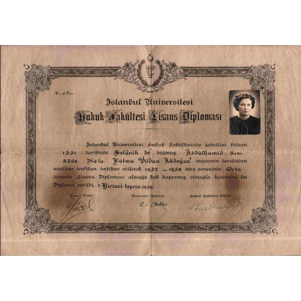 Hasan Ali Yücel´in (1897 - 1961) Maarif Vekili, Cemil Bilsel´in (1879 - 1949) Üniversite Rektörü, Ali Fuad Başgil´in (1893 - 1967) de Hukuk Fakültesi Dekanı olarak imzaladığı, Fatma Vildan Akdoğan´a ait, 1939 tarihli, Hukuk Fakültesi Lisans diploması…