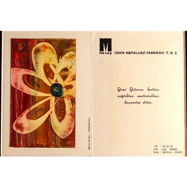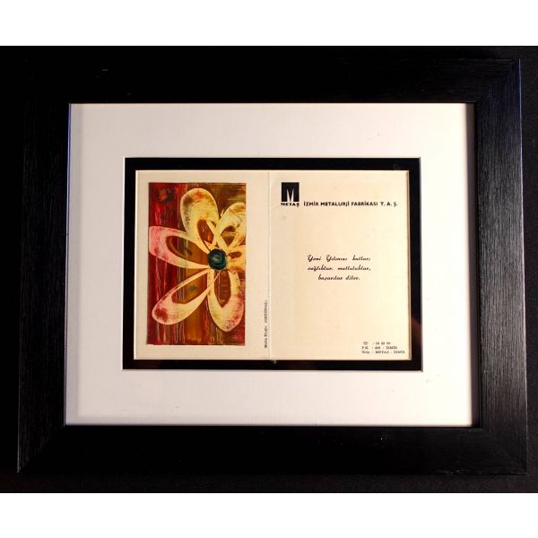 İzmir´in önde gelen sanayi kuruluşlarından Metaş Metalurji Fabrikası´nın, hatırlı müşterileri için hazırladığı, Metin Eloğlu imzalı, karton üzerine yağlıboya orijinal deseni yapıştırılmış yeni yıl kartı… Desen ölçüleri: 8,5x14 cm… Tebrik kartı ölçüleri: 24x17 cm…Çerçeve boyutları: 42x35 cm...