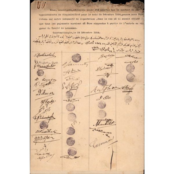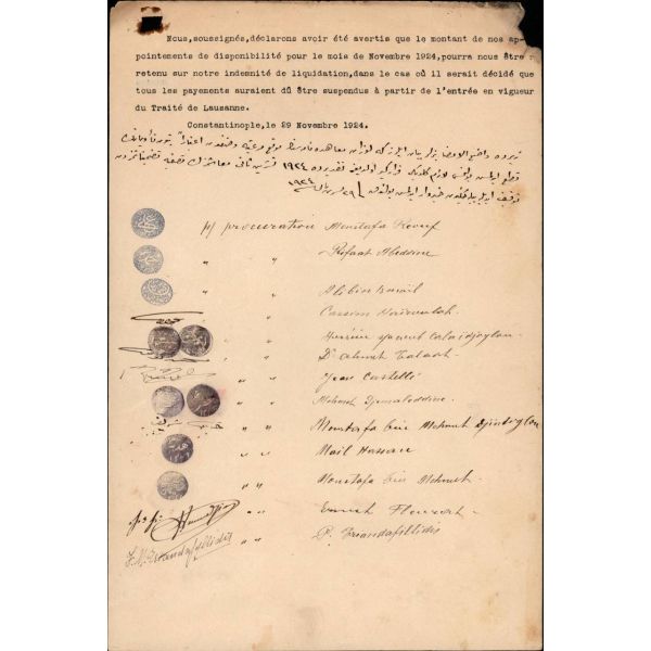 "Aşağıda imzası bulunan bizler beyan eyleriz ki Lozan Muahedenamesinin yürürlüğe girmesinden itibaren bütün ödemelerin kesilmiş bulunması lazım geldiği kararlaştırıldığı takdirde 1924 Teşrin-i Sani ve Kanun-ı Evvel maaşımızın tasfiye tazminatımızdan tevkif edilebileceğinden haberdar edilmiş bulunduk"