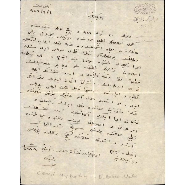Şeyh Sait İsyanına ilişkin istihbarat mektuplaşmaları kapsamında olup Diyarbakır Vilayeti ile 3. Ordu Müfettişliğine yazılan mektup, "Vilayetin 20 Şubat 1926 ve 3/18 numaralı şifresinde umumi ıslahatın tatbiki sırasında Diyarbakır'da Cemil Paşa birinci ailelerinden bazı eşhasın da garbe nakli icap edeceğinden vekaletin bu husustaki nokta-i nazarı sorulmuş idi. [...] Ordu müfettişliğinin amir-i örfü ve ıslahatı on beş vilayette aynı tarzda tatbik mevkiinde bulunması hasebiyle müşarun ileyhin arzu ve işareti hilafında hiçbir harekette bulunmamasını ihtar ederim." ifadelerini içermektedir.