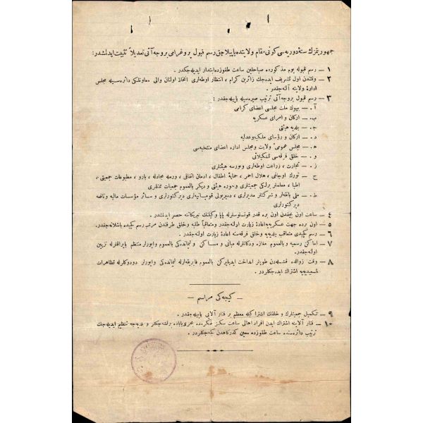 " [...] 4- Saat on buçuktan on bire kadar konsoloslarla Papa vekilinin tebriklerine hasredilmiştir. .... 8- Vakt-i zevalde kışladan toplar atılırken tüm fabrikalarla limandaki vapurlar düdüklerle tezahürata katılacaklardır."