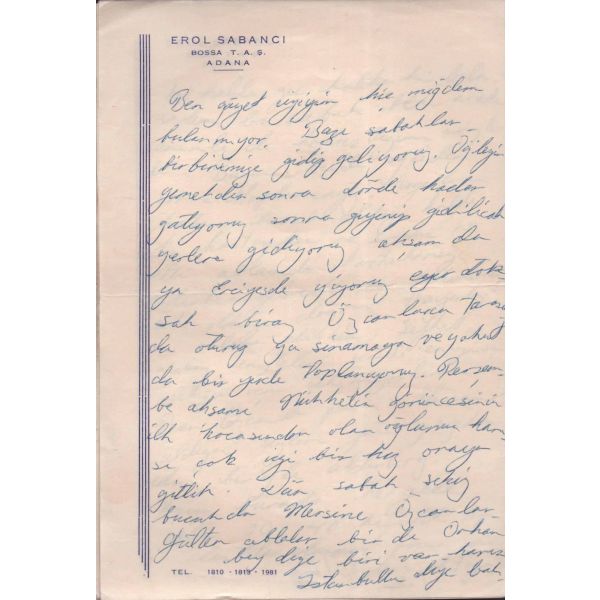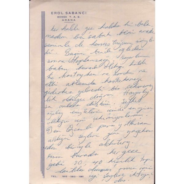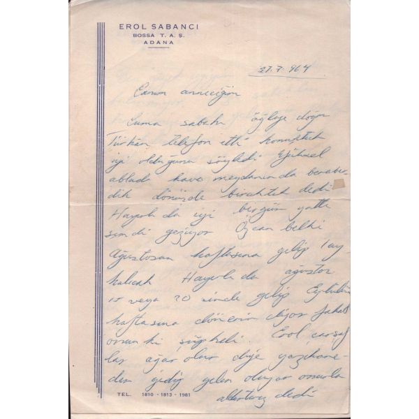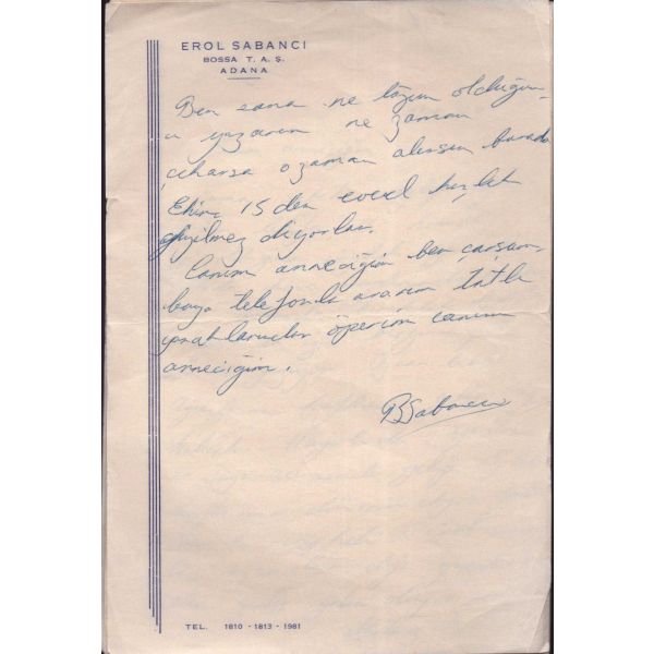 "Canım anneciğim, ben çarşambaya telefonla ararım. Tatlı yanaklarından öperim canım anneciğim." ifadeleriyle sonlanan mektup, Erol Sabancı'nın annesine hitaben tafsilatlı bir şekilde kaleme aldığı günlük rutinlerini ihtiva etmektedir.