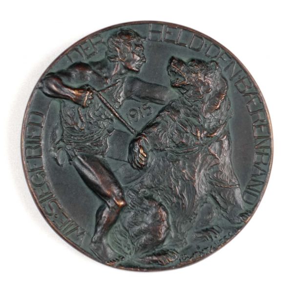 Prusya ordusunda uzun yıllar görev yaptıktan sonra 1911 yılında emekliliğe ayrılmış olan Prusyalı-Alman mareşal Paul von Hindenburg, 1914 yılında Birinci Dünya Savaşı´nın başlaması üzerine tekrar orduya çağrılmış ve Sekizinci Ordu´nun komutasına verilmiştir. Masurian Gölleri Savaşı ile Tannenberg Muharebesi´nde kazandığı zaferle ulusal kahraman haline gelen Hinderburg, Kasım 1914´te gerçekleşen Lodz Savaşı´ndan sonra mareşallik rütbesine terfi etmiş; 1916´da ise tüm Alman Kara Kuvvetlerinin komutanı olmuştur. Paul von Hinderburg´un halk nezdindeki itibarının hayli yüksek olduğu 1915 yılında üretilen madalyon, Hinderburg´u cesaret, yiğitlik ve şövalyeliği temsil eden mitolojik kahraman Siegfried ile özdeşleştirmektedir. Madalyonun arka yüzünde Rusya´yı temsil eden ayıyı bağlarken tasvir edilen Siegfried, 19. yüzyılda Alman milliyetçiliğinin yükselmesinde tarihsel bir öneme sahiptir.