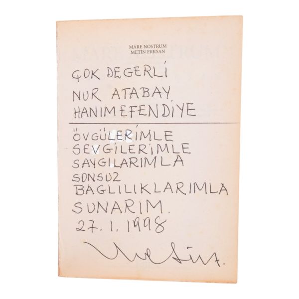 "Çok değerli Nur Atabay Hanımefendiye övgülerimle, sevgilerimle saygılarımla sonsuz bağlılıklarımla sunarım" ithafıyla, 27 Ocak 1998 tarihinde imzalanmıştır.