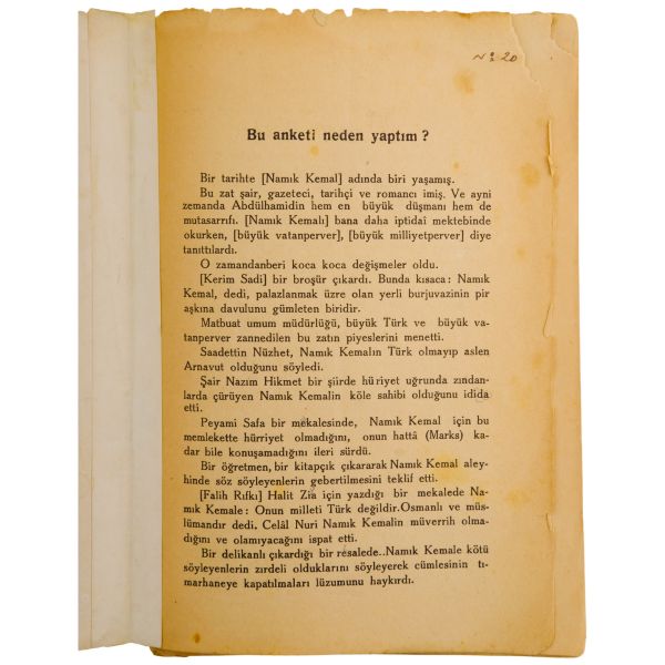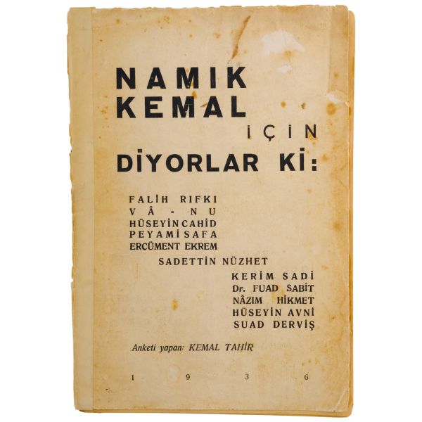 Kemal Tahir´in yayımlanmış ilk eseri olan bu küçük kitap, yazarın Namık Kemal hakkında hazırladığı anket sorularına; Falih Rıfkı, Vâlâ Nureddin, Hüseyin Cahit, Peyami Safa, Ercüment Ekrem, Sadettin Nüzhet, Kerim Sadi, Dr. Fuad Sabit, Nâzım Hikmet, Hüseyin Avni ve Suat Derviş’in verdiği cevaplardan oluşuyor. Namık Kemal´in, işret sofrasında Peygamber´in adı geçtiğinde rakıyı dışarı çıkarıp salavat getirmesi ama her akşam da içki içmeye devam etmesi gibi ilginç ayrıntılar içeren kitap, yayımlandığı dönemde küçük çaplı bir kıyamet koparmıştı. *Cilt ve sayfalar birbirinden ayrılmıştır.