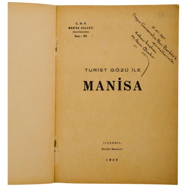 "Sayın Generalim Nuri Berköz´e hürmetlerimle." ithafıyla, Halkevi Başkanı M. Azmi Önakın tarafından imzalanmıştır. Bazıları renkli kuşe baskı olmak üzere çok sayıda görsel içeren kitabın sonunda katlanır Manisa Şehir Planı mevcuttur.