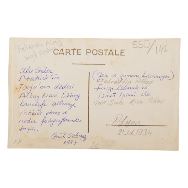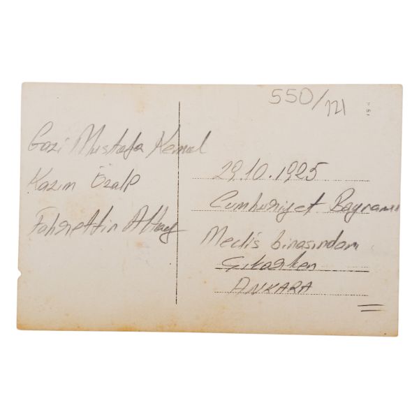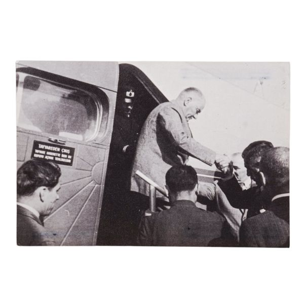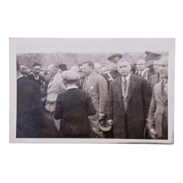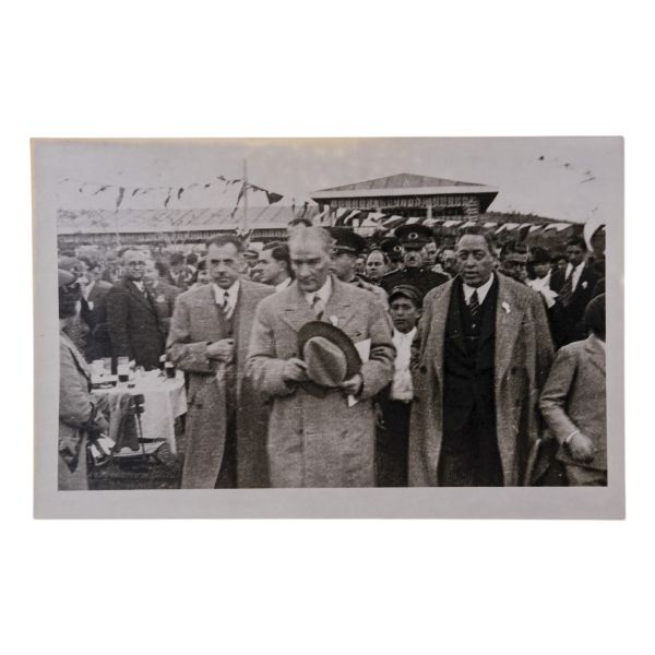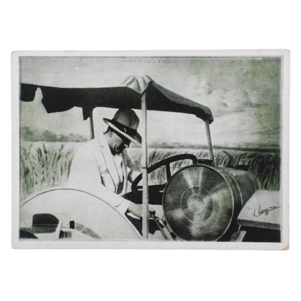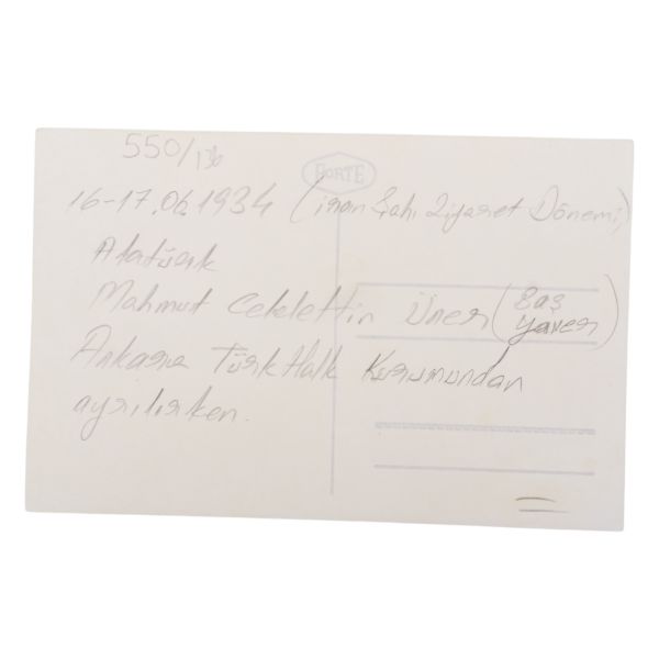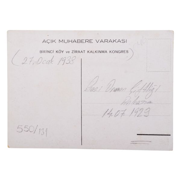 Kartın arka yüzünde, matbu olarak, "Birinci Köy ve Ziraat Kalkınma Kongresi" ibaresi mevcuttur. Müzayedemizde yer alan bu parça, 27 Ocak 1938 tarihinde düzenlenen bu kongreye katılanlara armağan edilmiştir.