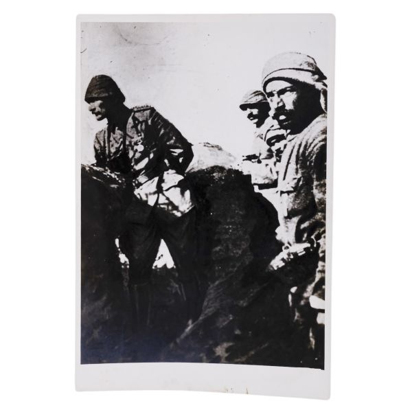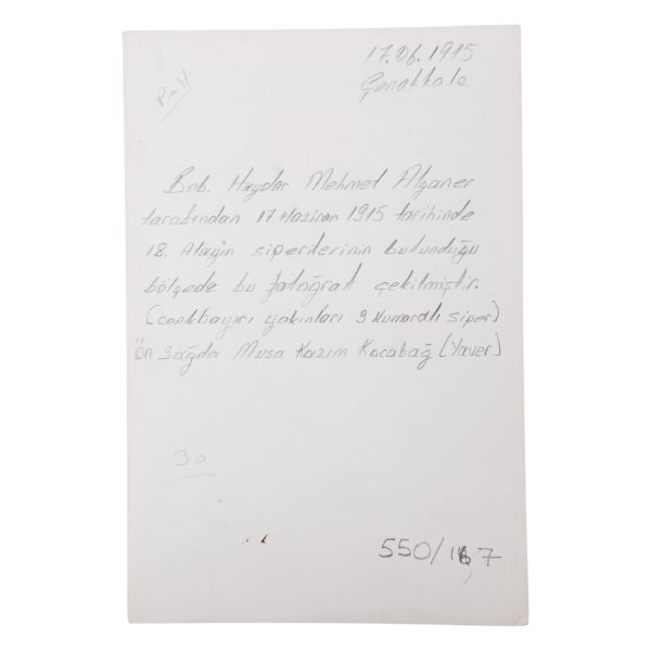 *İkinci baskıdır. Arka yüzüne el yazısıyla açıklama not düşülmüştür: 17.06.1915 Çanakkale - Bnb. Haydar Mehmet Alganer tarafından 17 Haziran 1915 tarihinde 18. Alay´ın siperlerinin bulunduğu bölgede bu fotoğraf çekilmiştir. (Conkbayırı yakınları 9 numaralı siper.) Ön sağda Musa Kazım Kocabağ (Yaver)."