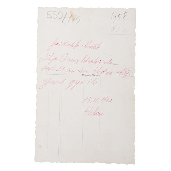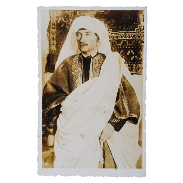 Bursa´nın Yunan kuvvetleri tarafından işgali üzerine, Milli Mücadele´ye destek vermek amacıyla Kasım 1920’de Ankara’ya gelen Şeyh Senûsî için tertip edilen ziyafette, Şeyh Senusî tarafından Mustafa Kemal Atatürk´e Trablusgarp´ın yerel kıyafetleri hediye edilmiştir. Arka yüzü el yazısı açıklamalı.