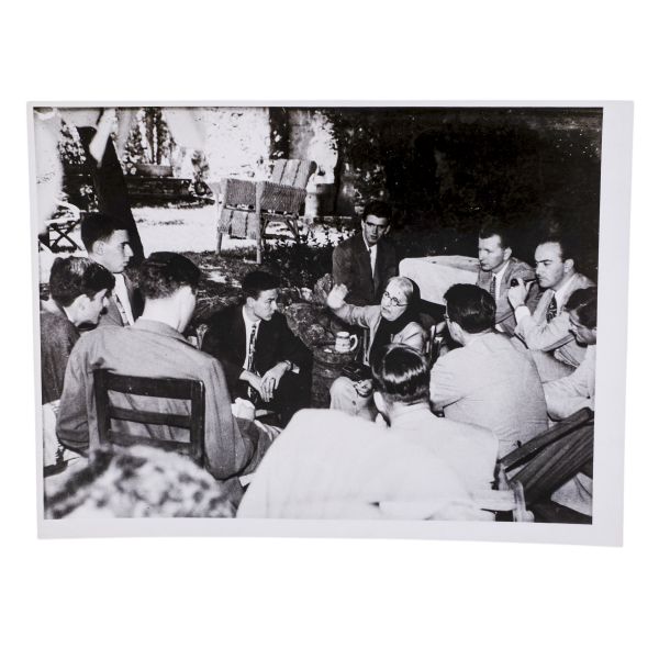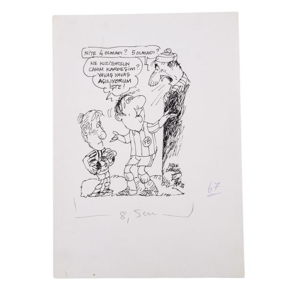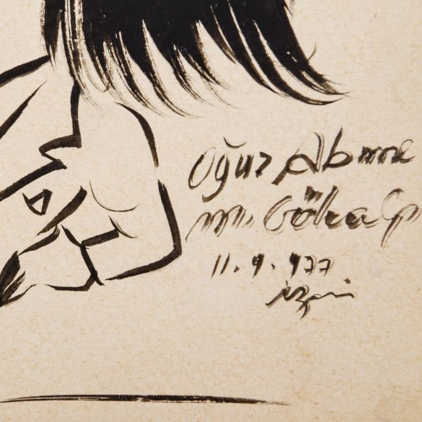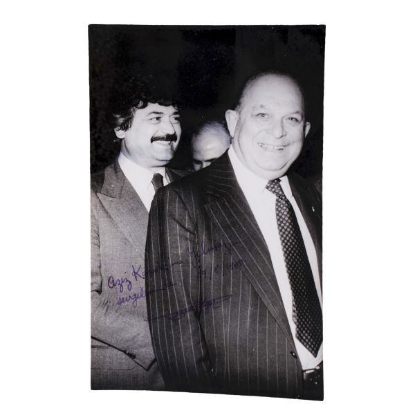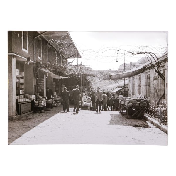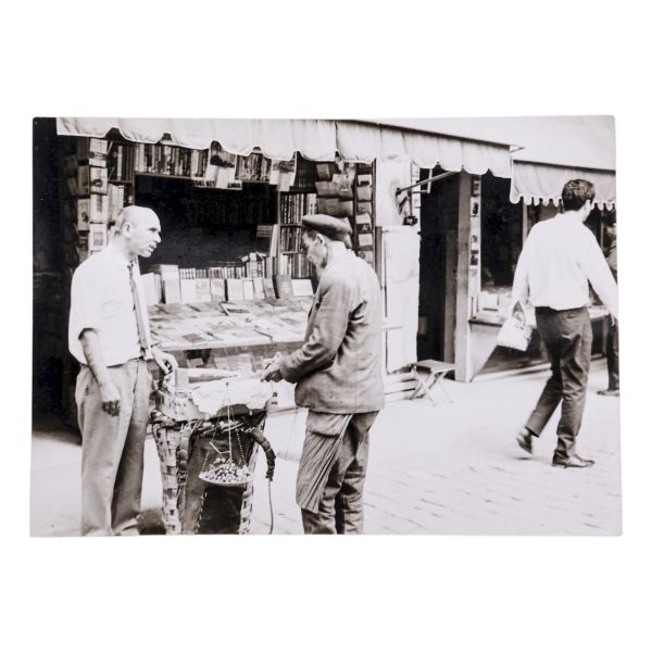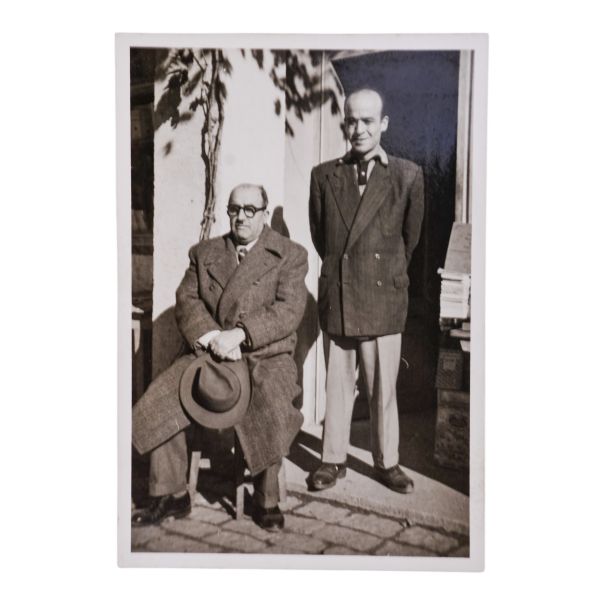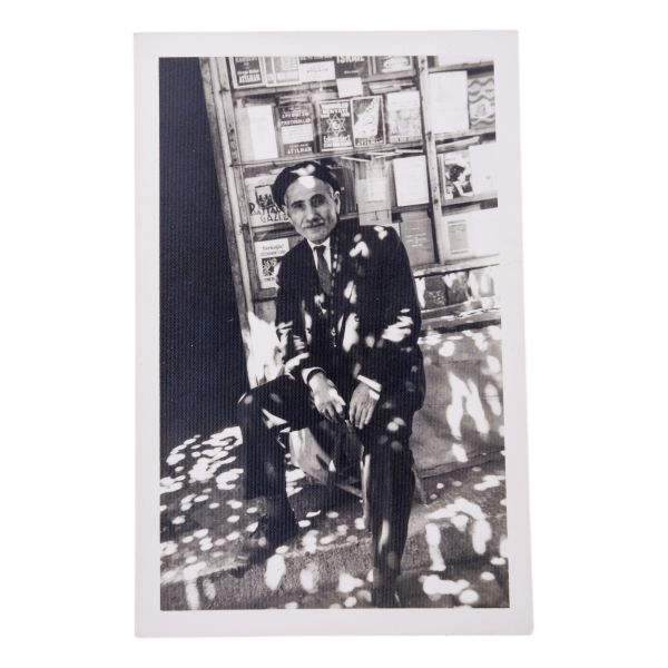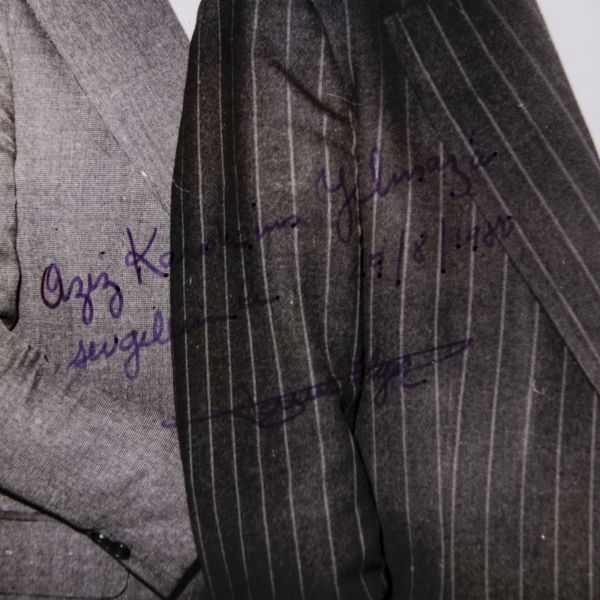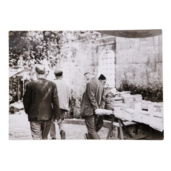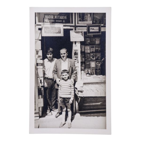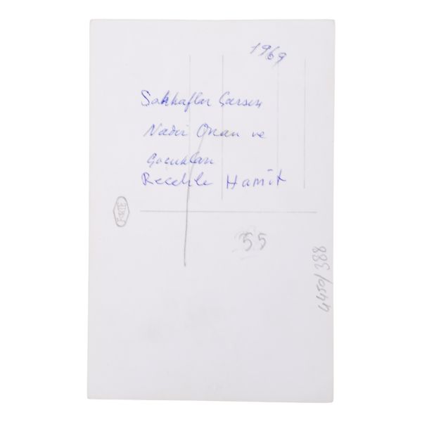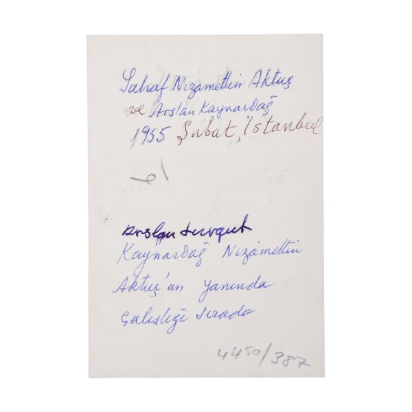 Arka yüzüne el yazısıyla açıklama yazılmıştır: "Sahaf Nizamettin Aktuç ve Arslan Kaynardağ. 1955 Şubat, İstanbul. Arslan Turgut Kaynardağ, Nizamettin Aktuç´un yanında çalıştığı sırada."