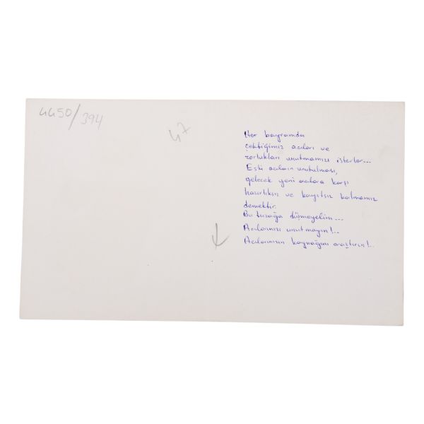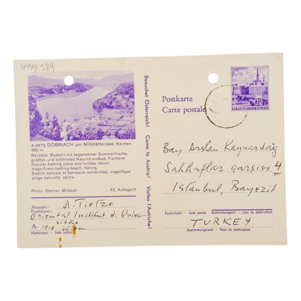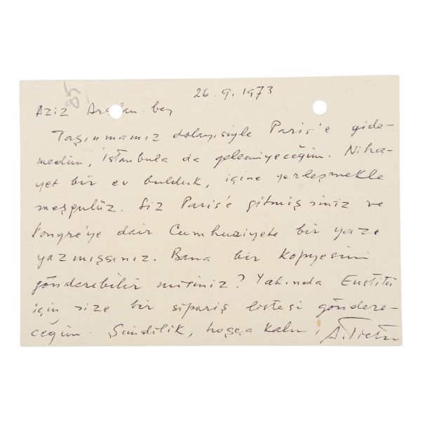 "Aziz Arslan Bey, Taşınmamız dolayısiyle Paris´e gidemedim, İstanbula da gelemiyeceğim. Nihayet bir ev bulduk, içine yerleşmekle meşgulüz. Siz Paris´e gitmişsiniz ve kongreye dair Cumhuriyete (gazete) bir yazı yazmışsınız. Bana bir kopyasını gönderebilir misiniz? Yakında Enstitü için size bir sipariş listesi göndereceğim. Şimdilik, hoşça kalın. A. Tietze."