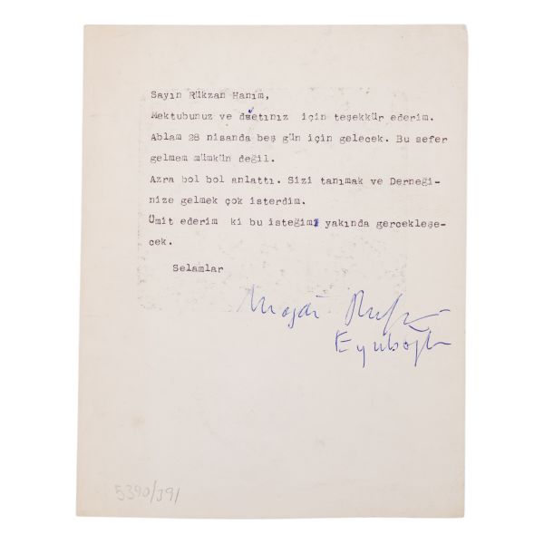 "Sayın Rükzan Hanım, Mektubunuz ve davetiniz için teşekkür ederim. Ablam 28 Nisanda beş gün için gelecek. Bu sefer gelmem mümkün değil. Azra bol bol anlattı. Sizi tanımak ve Derneğinize gelmek çok isterdim. Ümit ederim ki bu isteğim yakında gerçekleşecek. Selamlar, Magdi Rufer Eyuboğlu."