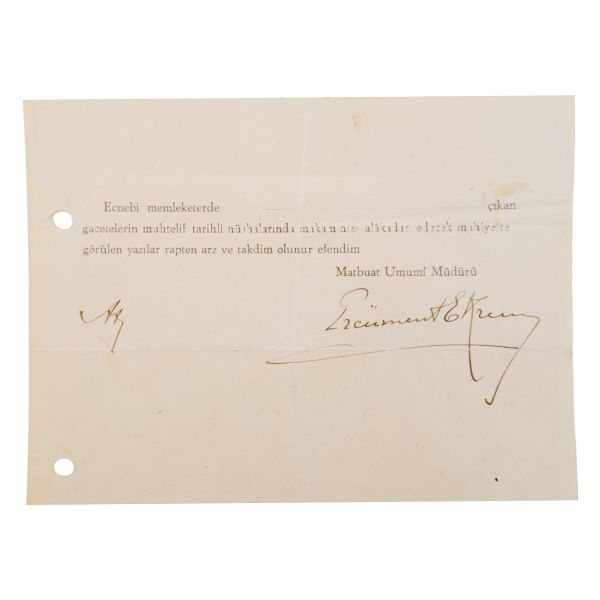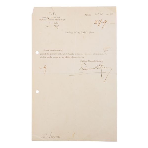 "Turing Kulüp Reisliğine, Ecnebi memleketlerde çıkan gazetelerin muhtelif tarihli nüshalarında makamınızı alâkadar edecek mahiyette görülen yazılar rapten (ek olarak) arz ve takdim olunur efendim. Matbuat Umumî Müdürü Ercüment Ekrem." Mektup kâğıdı Osmanlıca filigranlıdır.