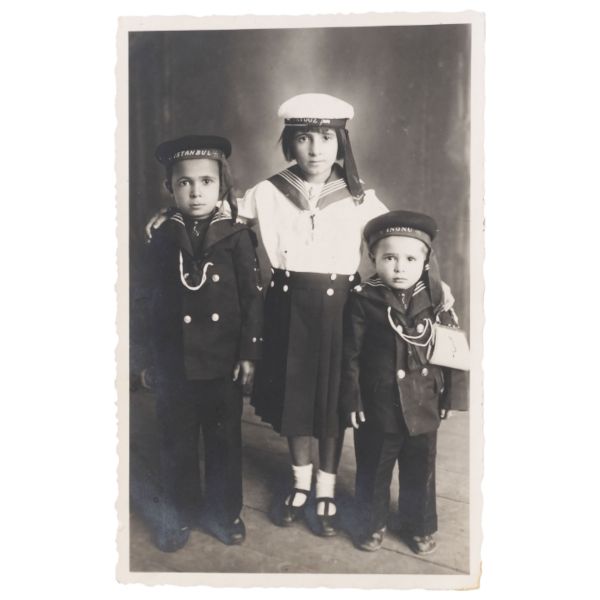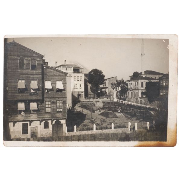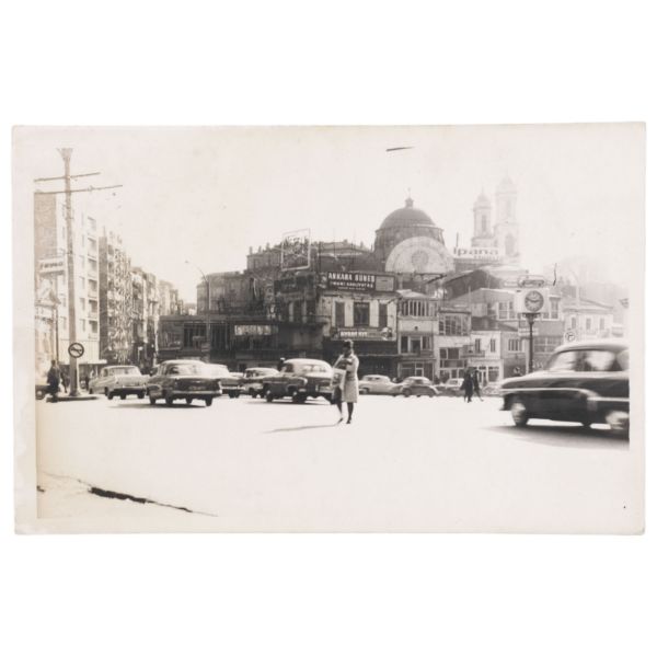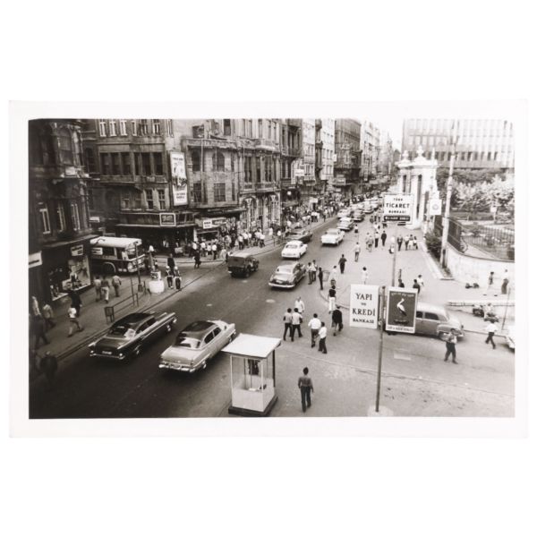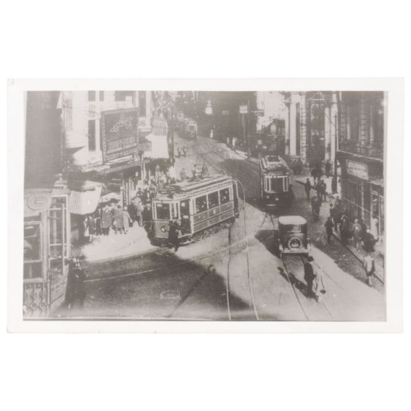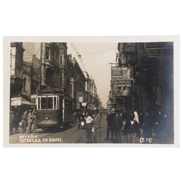 Sol tarafta "Foto Tan" tabelası ve "Maçka-Beyazıt" tramvayı; sağ tarafta "Prenses Maya" ve "Ejderin Kızı" filmlerinin Türkçe-Fransızca yazılı tanıtım tabelası görülmektedir.
