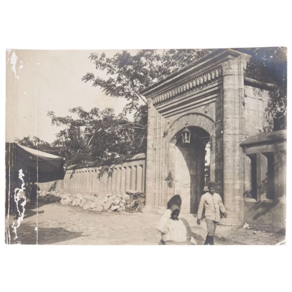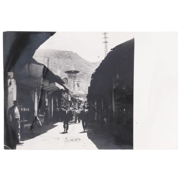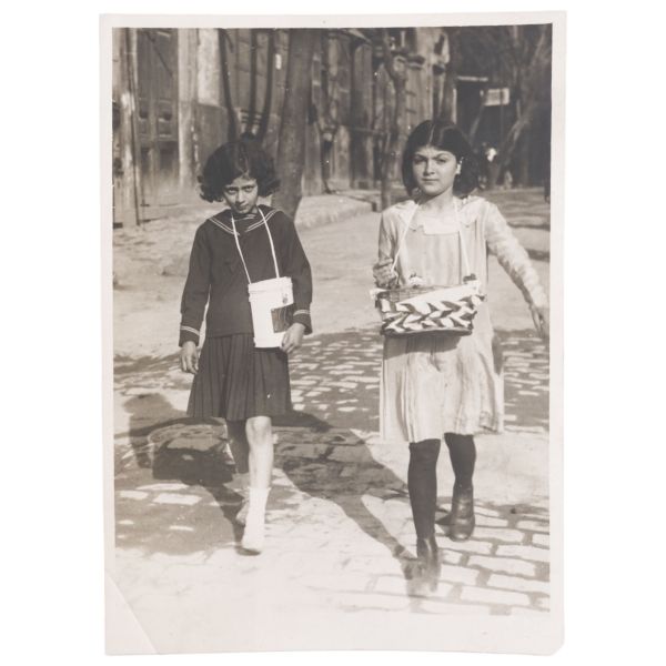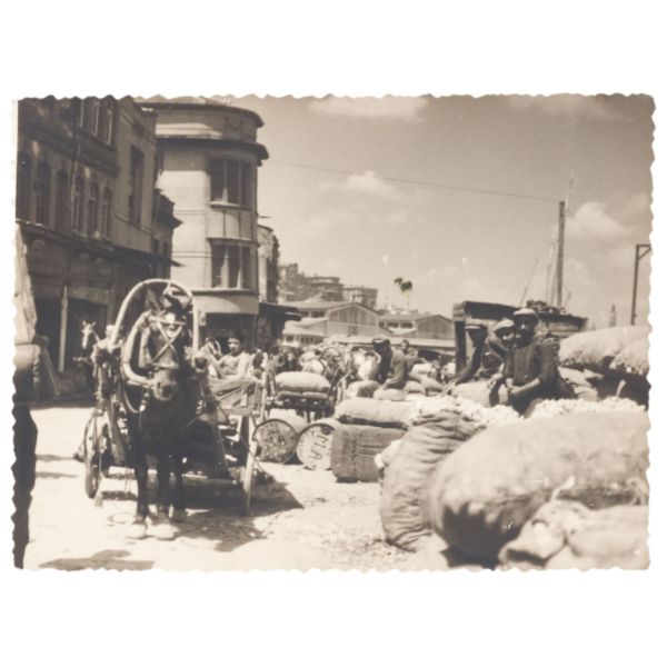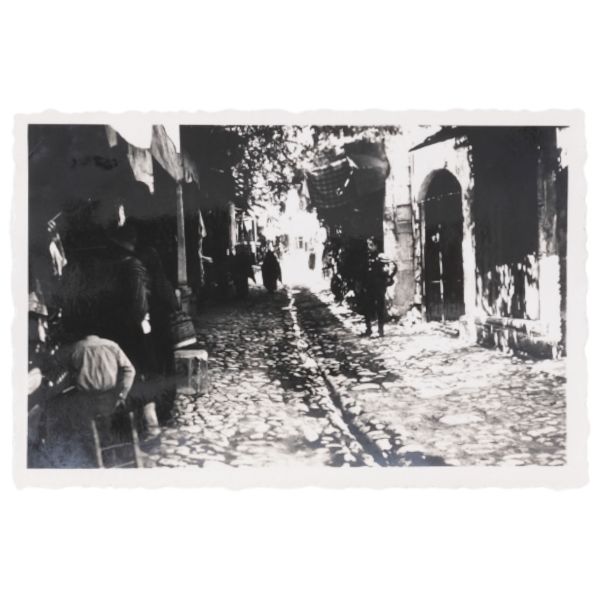 Fotoğrafta; caddeden geçen "Harbiye-Taksim" tramvayı, "Vatman Dur" tabelası, "Yani Kostazos Çiçekçi" ve "Zarif Korse Eskenazi" işyeri tabelaları gibi detaylar görülmektedir.