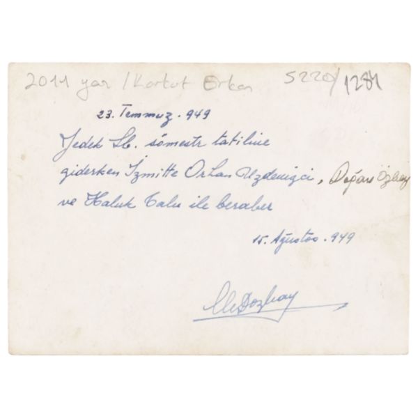 "Yedek Sb. sömestr tatiline giderken İzmitte Orhan Uzdenizci, Doğan Özbay ve Haluk Talu ile beraber. 15 Ağustos 1949"