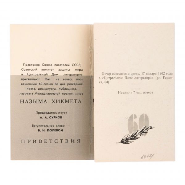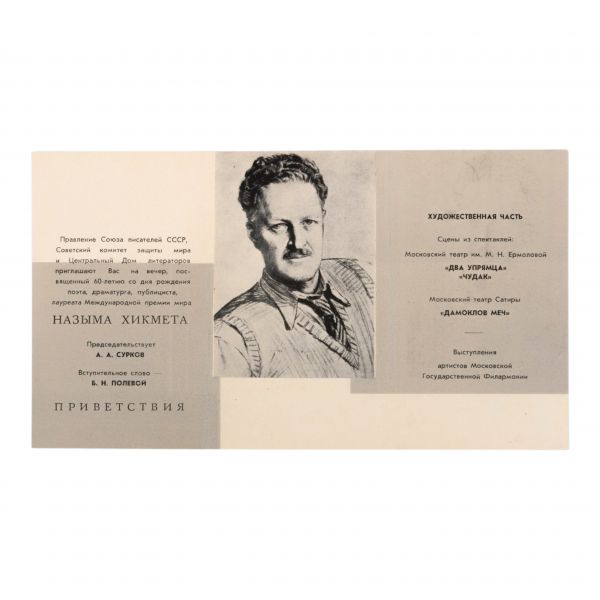 Nazım Hikmet için, SSCB Yazarlar Birliği Yönetimi, Sovyet Barış Komitesi ve Merkezi Edebiyatçılar Evi tarafından 1962 yılında düzenlenen; şairin 3 Haziran 1963’te, 61 yaşında vefat etmeden önceki son doğum gününden bir önceki yaşına denk gelen 60. doğum günü onuruna hazırlanan davetin programını içeren Rusça davetiye.