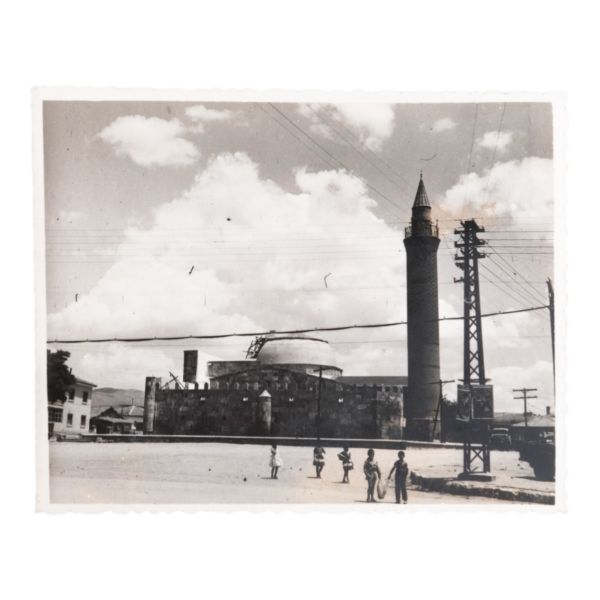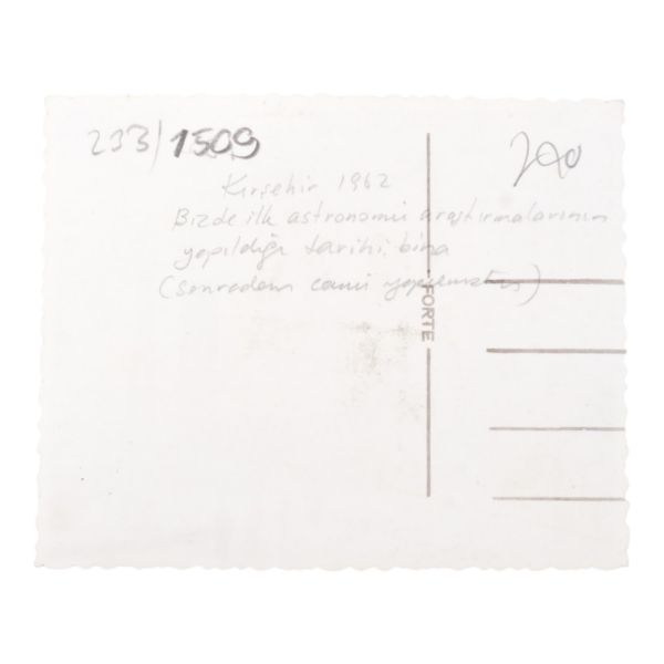 Fotoğrafın arka yüzüne düşülen not: "Kırşehir 1962 - Bizde ilk astronomi araştırmalarının yapıltığı tarihi bina. (Sonradan cami yapılmıştır.)"