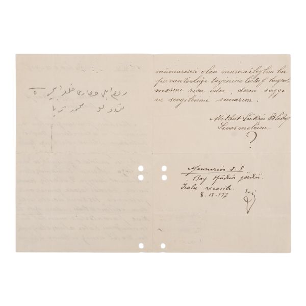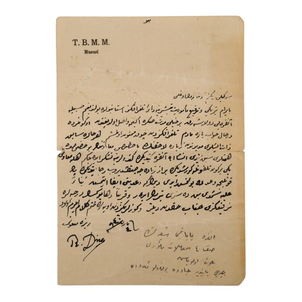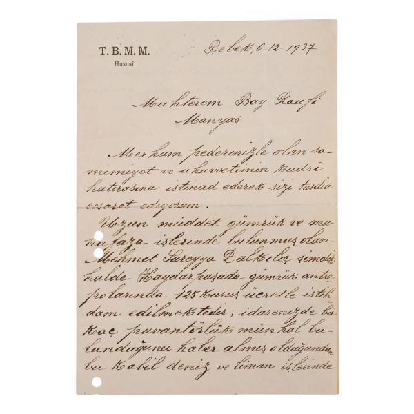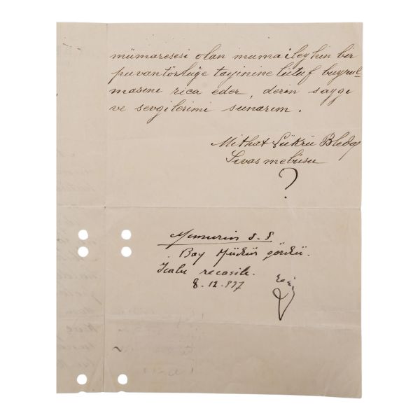 Mithat Şükrü Bleda mektubunda, uzun müddet gümrük ve muhafaza işlerinde bulunmuş olan ve o sıralar Haydarpaşa Gümrük Antreposunda çalışmakta olan Mehmet Süreyya Dalkılıç isimli beyefendinin tayin edilmesini rica etmektedir.