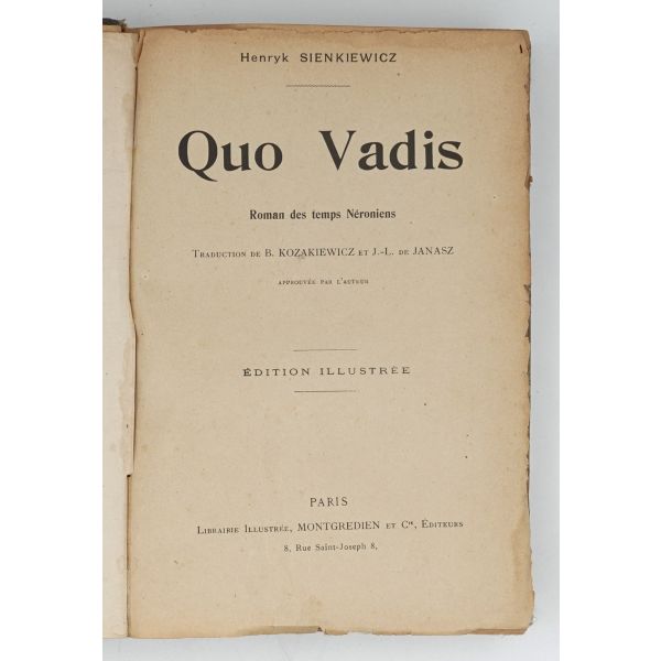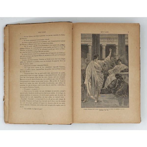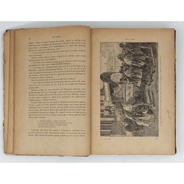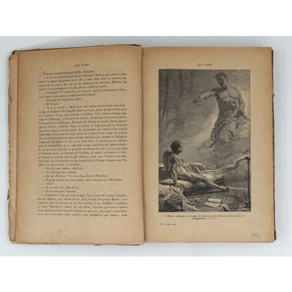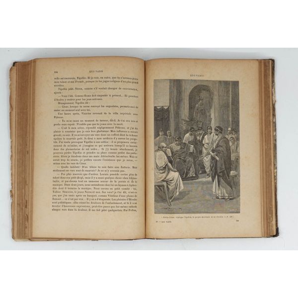 Henryk Sienkiewicz tarafından Lehçe kaleme alınan ve Roma İmparatorluğu´nda Hristiyanların karşılaştıkları baskıları bir imkansız aşk kurgusuyla okurlarla buluşturan tarihi romanın bol gravürlü Fransızca tercümesi... İç ve dış kapakları ebrulu, deri sırtlı dönem cildinde. *Sırtın üst bölümü haliyle.