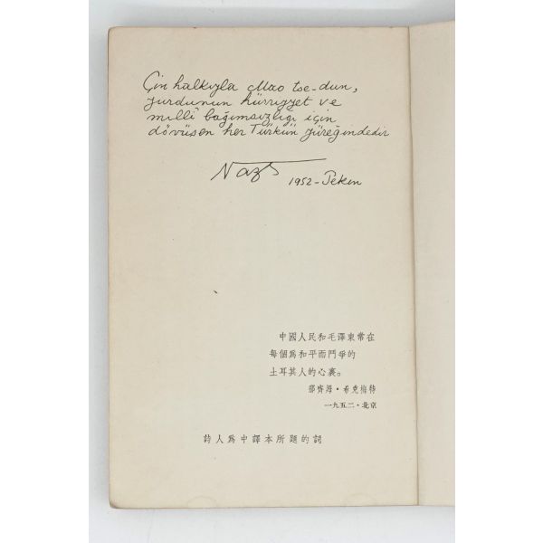 Kitabın ilk sayfasında, Nazım Hikmet´in 1952 yılında gerçekleştirdiği Pekin ziyaretinde kaleme aldığı samimi yazı, tıpkıbasımı ve Çince tercümesiyle yer almaktadır: “Çin halkıyla Mao Tse-dun, yurdunun hürriyet ve millî bağımsızlığı için dövüşen her Türkün yüreğindedir.”