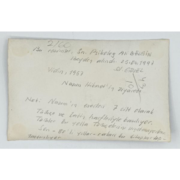 Bilindiği üzere Nazım Hikmet, 1957 yılından itibaren Yazarlar Birliği adına Sovyetler Birliği´nin doğusundaki ülkeleri ziyaret etmeye başlar. Bu ziyaretlerin ilk duraklarından birini teşkil eden Vidin´de çekilmiş bu fotoğraf, Nazım´ı orada yaşayan Türk öğrencilerle birlikte gösteren tarihi bir karedir. Fotoğrafın arka yüzüne el yazısıyla şu açıklama not düşülmüştür: "Vidin, 1957 - Nazım Hikmet'in gezisi... Son yıllarında hep memleket hasretiyle tutuşmuştu. 'Memleketim' şiiri bu hasretin neticesidir."