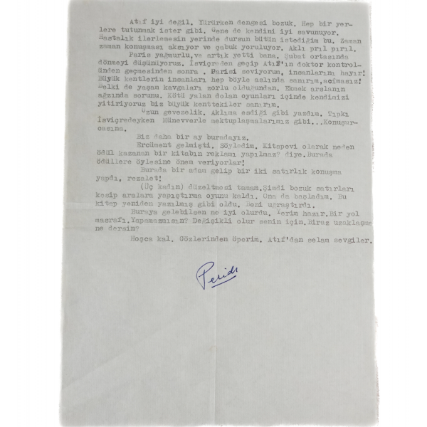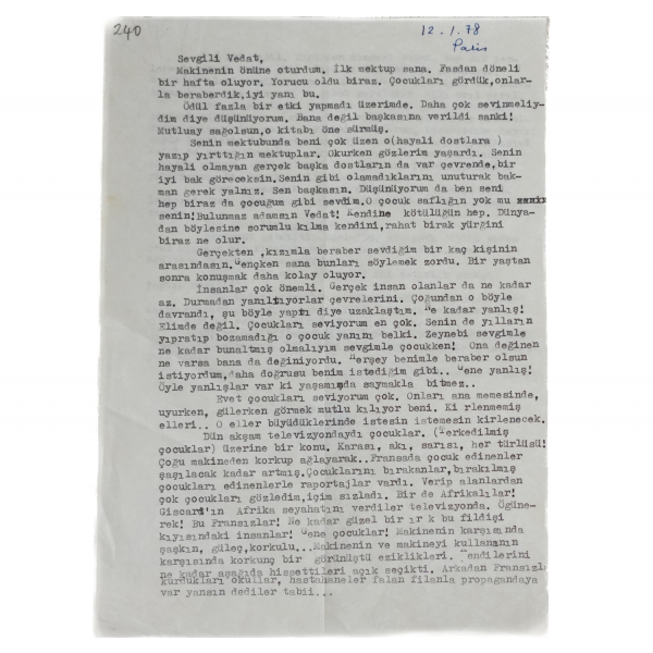 "Senin mektubunda beni çok üzen o (hayali dostlara) yazıp yırttığın mektuplar. Okurken gözlerim yaşardı. Senin hayali olmayan gerçek başka dostların da var çevrende, bir iyi bak göreceksin. Senin gibi olamadıklarını unutarak bakman gerek yalnız. Sen başkasın. Düşünüyorum da ben seni hep biraz da çocuğum gibi sevdim. O çocuk saflığın yok mu senin! Bulunmaz adamsın Vedat! Kendine kötülüğün hep. Dünyadan böylesine sorumlu kılma kendini, rahat bırak yüreğini biraz ne olur." (...) "Evet çocukları seviyorum çok. Onları ana memesinde, uyurken, gülerken görmek mutlu kılıyor beni. Kirlenmemiş elleri... O eller büyüdüklerinde istesin istemesin kirlenecek." (...) "Atıf iyi değil. Yürürken dengesi bozuk. Hep bir yerlere tutunmak ister gibi. Gene de kendini iyi savunuyor. Hastalık ilerlemesin yerinde dursun bütün isteğim bu. Zaman zaman konuşması aksıyor ve çabuk yoruluyor. Aklı pırıl pırıl."