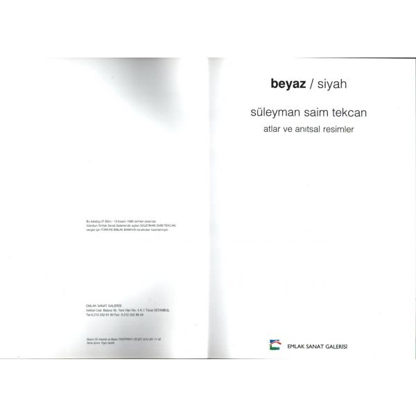 Bu katalog 27 Ekim-13 Kasım 1999 tarihleri arasında İstanbul/Emlak Sanat Galersinde açılan Süleyman Saim Tekcan sergisi için Türkiye Emlak Bankası tarafından hazırlanmıştır.