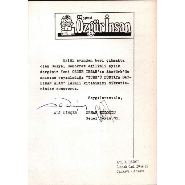 "Yeni Özgür İnsan" antetli kâğıtta, "Eylül ayından beri çıkmakta olan Sosyal Demokrat eğilimli aylık dergimiz Yeni ÖZGÜR İNSAN´ın Atatürk´ün anısına yayınladığı "TÜRK´Ü DÜNYAYA SAYDIRAN ADAM" isimli kitabımızı dikkatlerinize sunuyoruz. Saygılarımla, ALİ DİNÇER - ORHAN KOLOĞLU Genel Yayın Md." ifadeleri yer almaktadır.
