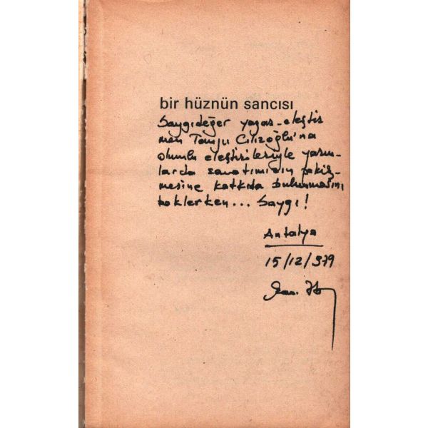 "Saygıdeğer yazar-eleştirmen Tanju Cılızoğlu´na olumlu eleştirileriyle yazımlarda sanatımızın pekişmesine katkıda bulunmasını beklerken... saygı!, Antalya 15.12.1979"