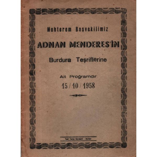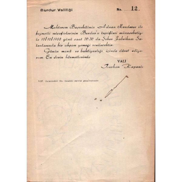 Kitapçık içerisinde Burdur Valisi Turgut Kapanlı´nın ıslak imzasını taşıyan bir davetiye mektubu mevcuttur. "Proğram: 1- Et, Balık Kurumu Soğuk Hava Deposunun açılışı 2- Devlet Hastahanesi Çocuk Pavyonunun açılışı 3- İmam Hatip Okulunun açılışı 4- Arzu ettikleri takdirde istimlâk sahasının tetkiki 5- Halen kampanyada olan Şeker Fabrikasını ziyaret 6- Susamlık tepeden Burdura umumi bir bakış 7- Kız Sanat okulunu ziyaret 8- İlçelerden gelen heyetleri kabul"