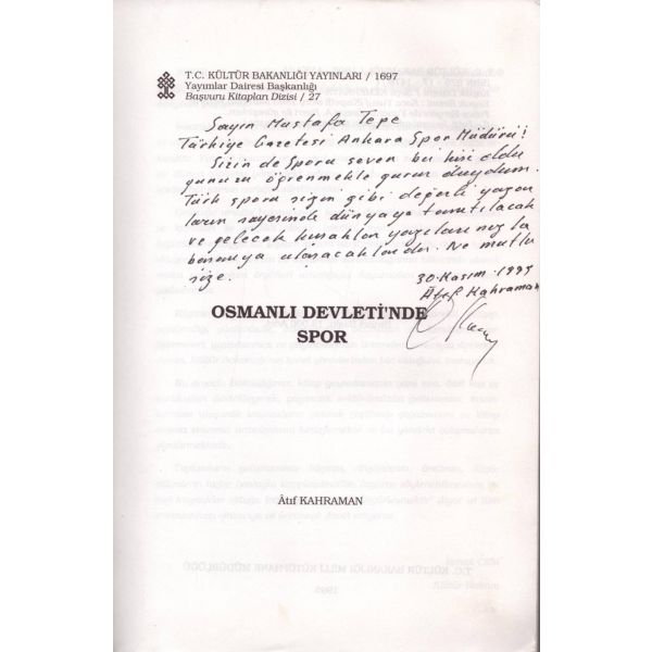 İthaf, "Sayın Mustafa Tepe - Türkiye Gazetesi Ankara Spor Müdürü; Sizin de sporu seven bir kişi olduğunuzu öğrenmekle gurur duydum. Türk sporu sizin gibi değerli yazarların sayesinde dünyaya tanıtılacak ve gelecek kuşaklar yazılarınızla başarıya ulaşacaklardır. Ne mutlu size. 30 Kasım 1995 Âtıf Kahraman" şeklindedir.