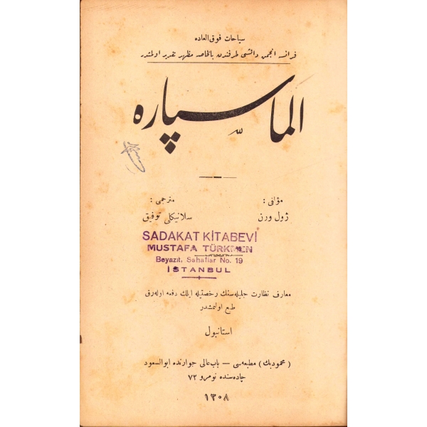 1. Elmaspare, Jules Verne, çev., Selanikli Tevfik, Mahmud Bey Matbaası, İstanbul, 1308, resimli, 230 sayfa , 14x20 cm, ÖZEGE; 4799.