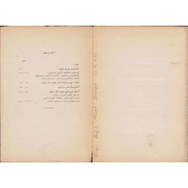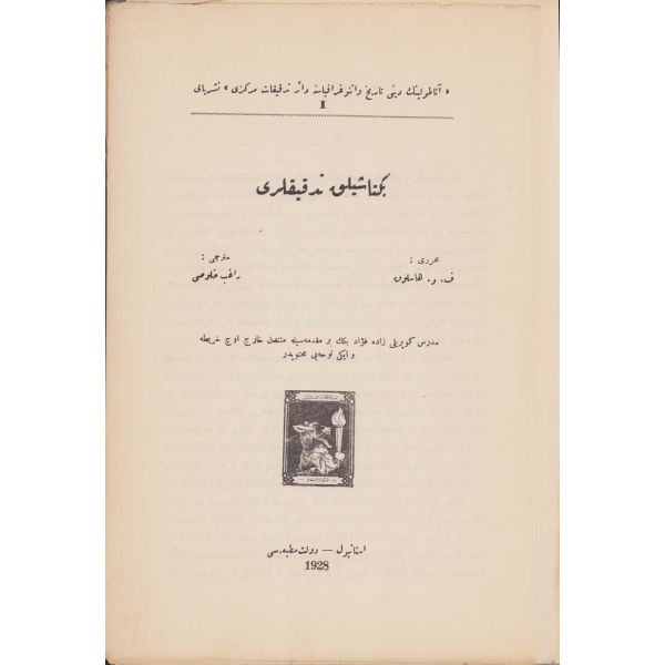 Kitapta Osmanlıca çevirmeni Kilisli Rıfat'tan Ragıp Paşa Kütüphanesi müdürü Fazıl beye 1943 yılında hediyedir yazılı. Ahmet Rıfat Bilge (1874, Kilis - 1953, Ankara), Türkoloji çalışmalarıyla tanınan bilim insanı ve öğretmen. Kâşgarlı Mahmud'un Dîvânü Lugati't-Türk adlı eserinin neşir ve tercümesini yapmış, döneminin birçok filozof ve araştırmacısıyla yakın ilişkiler kurmuştur. Türkler ve Türklükle alakalı birçok eserin ilk incelemesini yapması bu alanda tanınmasına vesile olmuştur. "Kilisli Muallim Rifat" olarak da bilinmektedir.