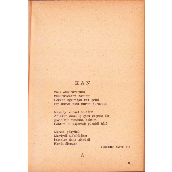 Şiirin asıl adı Bir Yaz Gecesidir İşveyle, fısıltıyla, gülüşle Olmuş sebi sevda yine bihap Oklar gibi saplanmada kalbe Düştükçe semadan yere mehtap... Buseyle kilitlenmiş ağızlar Gözler neler eyler neler israp!.. Uçmakta bu ateşli havada Vuslat demi bir kuş gibi bitap...