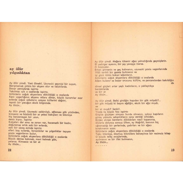 İthaf, "Turgay Gönenç'e sevgi. 5.11.962" şeklindedir. "Sen belki de sonsuz bir çinisin, kerestesin/ olmadığı tabelasız dükkanların ve uzayıp giden/ duran bir zamanın"